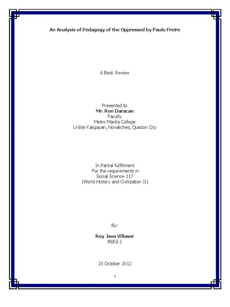 A pedagogy of the oppressed for Freire is designed to help people regain their humanity. Its within this context that Freire writes Pedagogy of the Oppressed. Pedagogy of the Oppressed- Chapter 1 2 Review Amal El-Jabali Athabasca University f El.